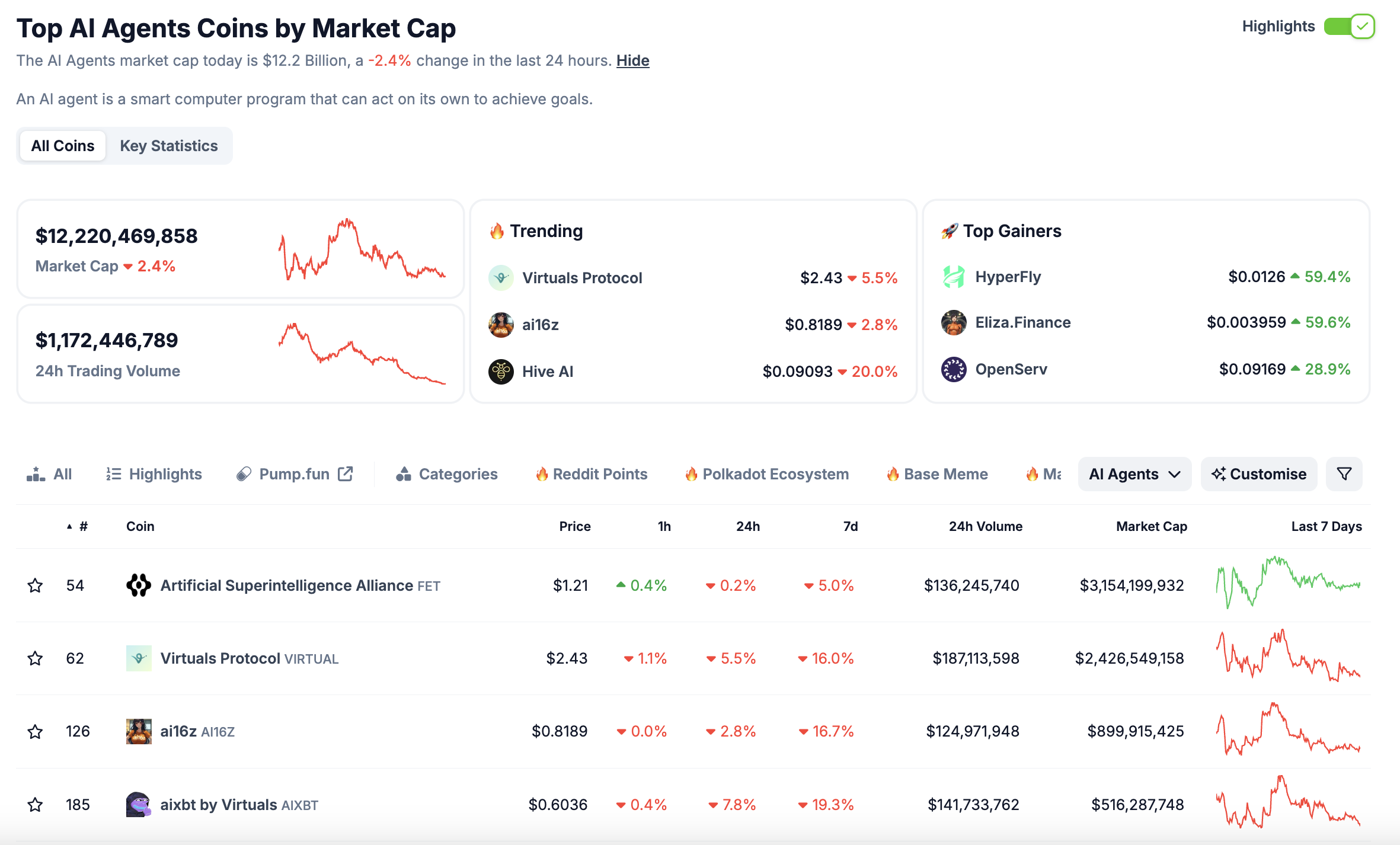 The crypto AI agent market cap today stands at $12.2B, according to CoinGecko.